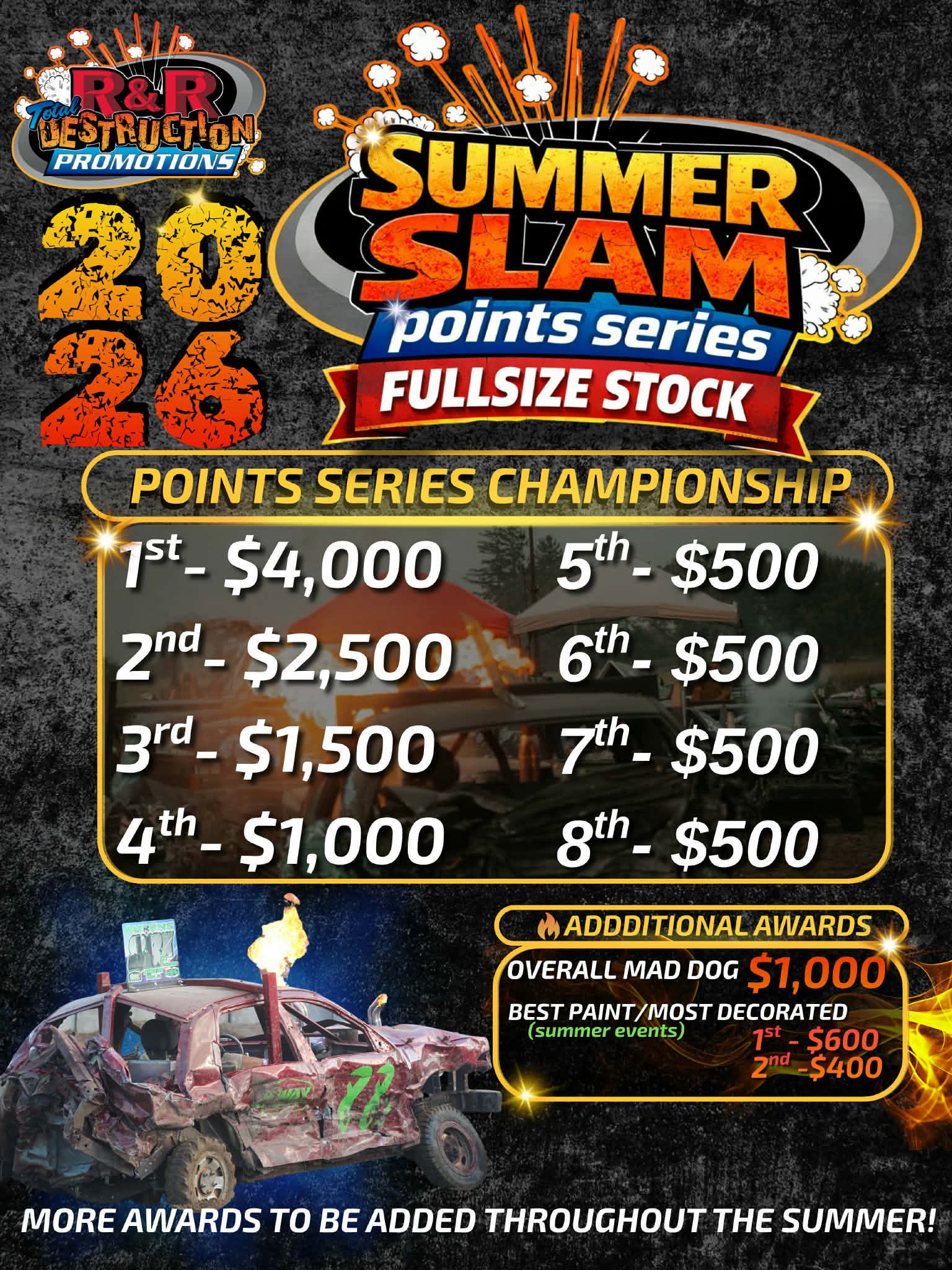 R&R Destruction Promotionsspecializes in promoting auto, truck demolition, and figure eight races. R&R's simple philosophy is to provide driver's and spectators with the best possible event. Our goal is to promote this sport into a higher level by providing enjoyment for the spectators, fair competition, trophies, and last but not least higher prize money. R&R's high set of standards has created a following of drivers that attend their events.